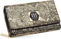 Portfel damski z naturalnej skóry. Wnętrze zostało starannie zaprojektowane, oferując liczne przegródki na karty, przestronne kieszenie na banknoty oraz praktyczną przegrodę zapinaną na suwak, idealną do przechowywania monet. Dodatkowo, portfel ma miejsce na zdjęcie.