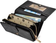 Portfel damski z naturalnej skóry. Wnętrze zostało starannie zaprojektowane, oferując liczne przegródki na karty, przestronne kieszenie na banknoty oraz praktyczną przegrodę zapinaną na suwak, idealną do przechowywania monet. Dodatkowo, portfel ma miejsce na zdjęcie.