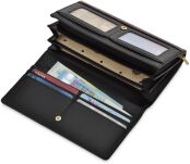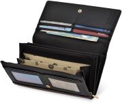Portfel damski ze wzorem. Wnętrze zostało starannie zaprojektowane – znajdziesz w nim liczne przegródki na karty, przestronne kieszenie na banknoty oraz praktyczną przegrodę zapinaną na suwak, idealną do przechowywania monet. Dodatkowym atutem są dwa okienka na zdjęcia. Portfel zamykany jest na klapę z wygodnym zatrzaskiem.