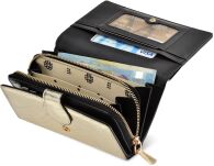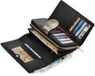 Portfel damski z naturalnej skóry. Wnętrze zostało starannie zaprojektowane, oferując liczne przegródki na karty, przestronne kieszenie na banknoty oraz praktyczną przegrodę zapinaną na suwak, idealną do przechowywania monet. Dodatkowo, portfel ma miejsce na zdjęcie.