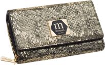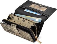 Portfel damski z naturalnej skóry. Wnętrze zostało starannie zaprojektowane, oferując liczne przegródki na karty, przestronne kieszenie na banknoty oraz praktyczną przegrodę zapinaną na suwak, idealną do przechowywania monet. Dodatkowo, portfel ma miejsce na zdjęcie.